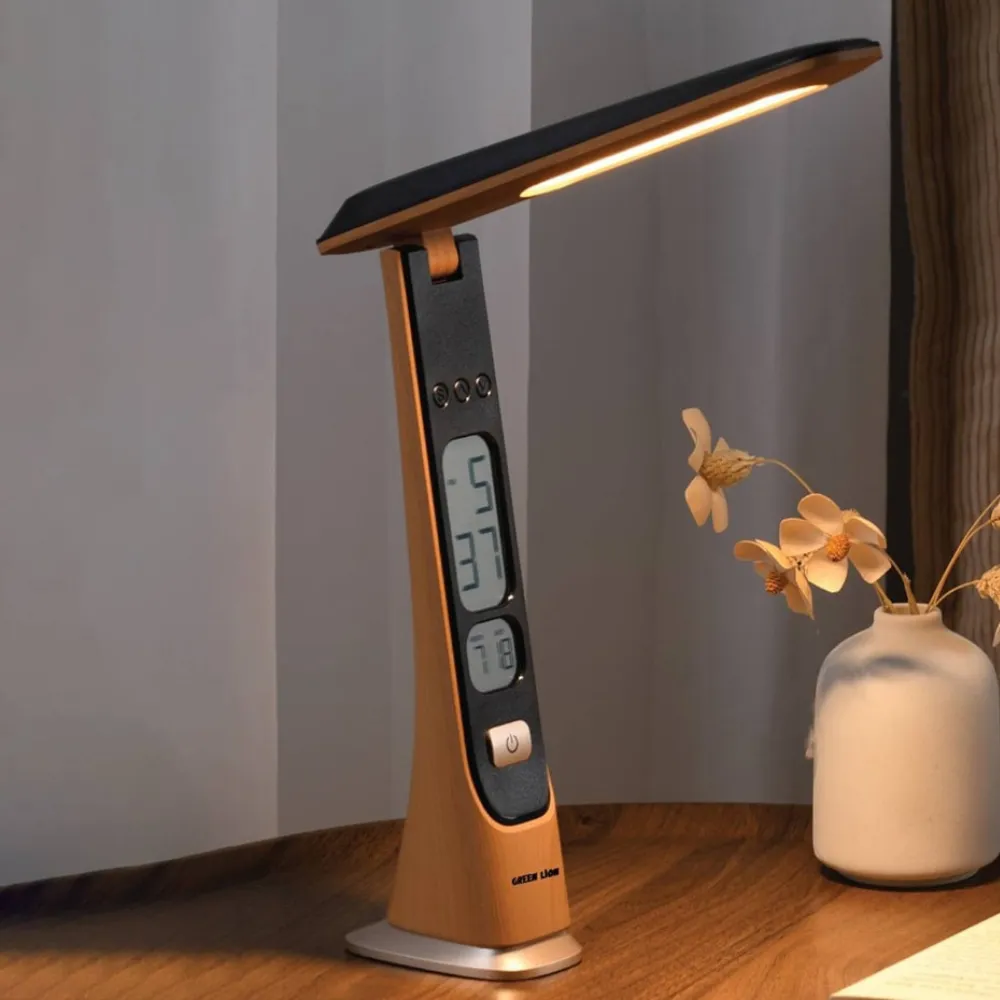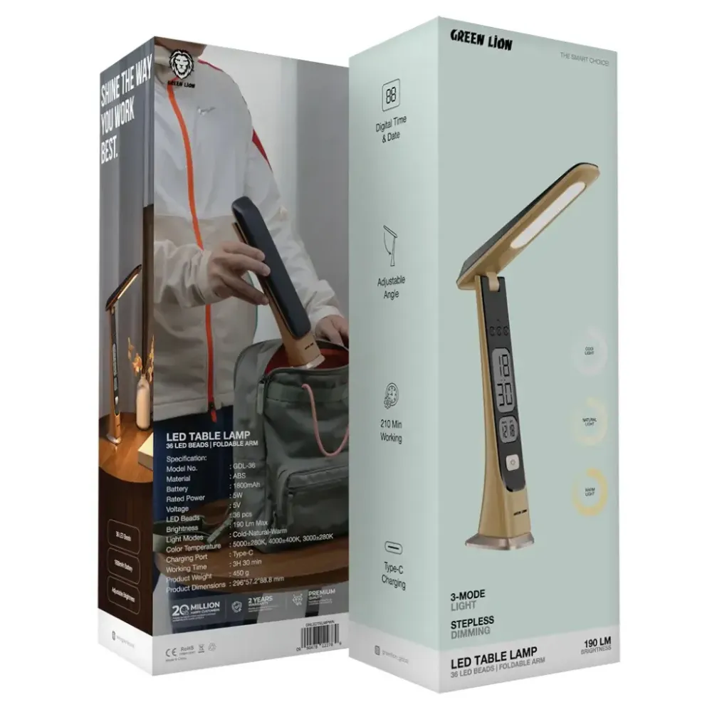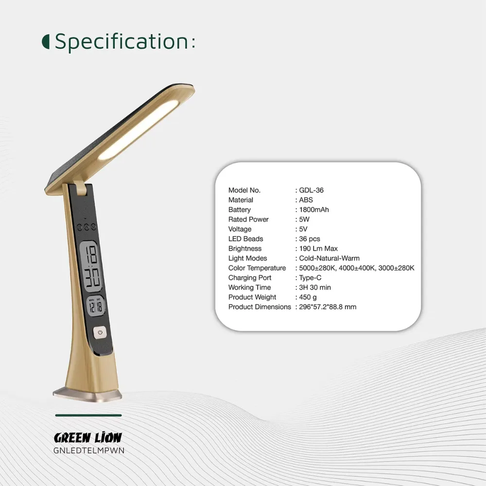 Brighten your space with the Green Lion LED Table Lamp Wooden, a perfect blend of functionality and modern design. Built with durable ABS material and a sleek wooden finish, this lamp offers both style and practicality. Equipped with 36 high-quality LED beads, it delivers up to 190 lumens of brightness with three adjustable modes—Cold, Natural, and Warm—to suit any setting. The step-less dimming feature allows precise control, while its adjustable angle ensures optimal lighting for reading, studying, or relaxing. Powered by a reliable 1800mAh battery, it provides wireless convenience and recharges easily through its Type-C port. With added features like a digital time and date display, this lamp is ideal for desks, bedrooms, or offices, making it a versatile and energy-efficient lighting solution.