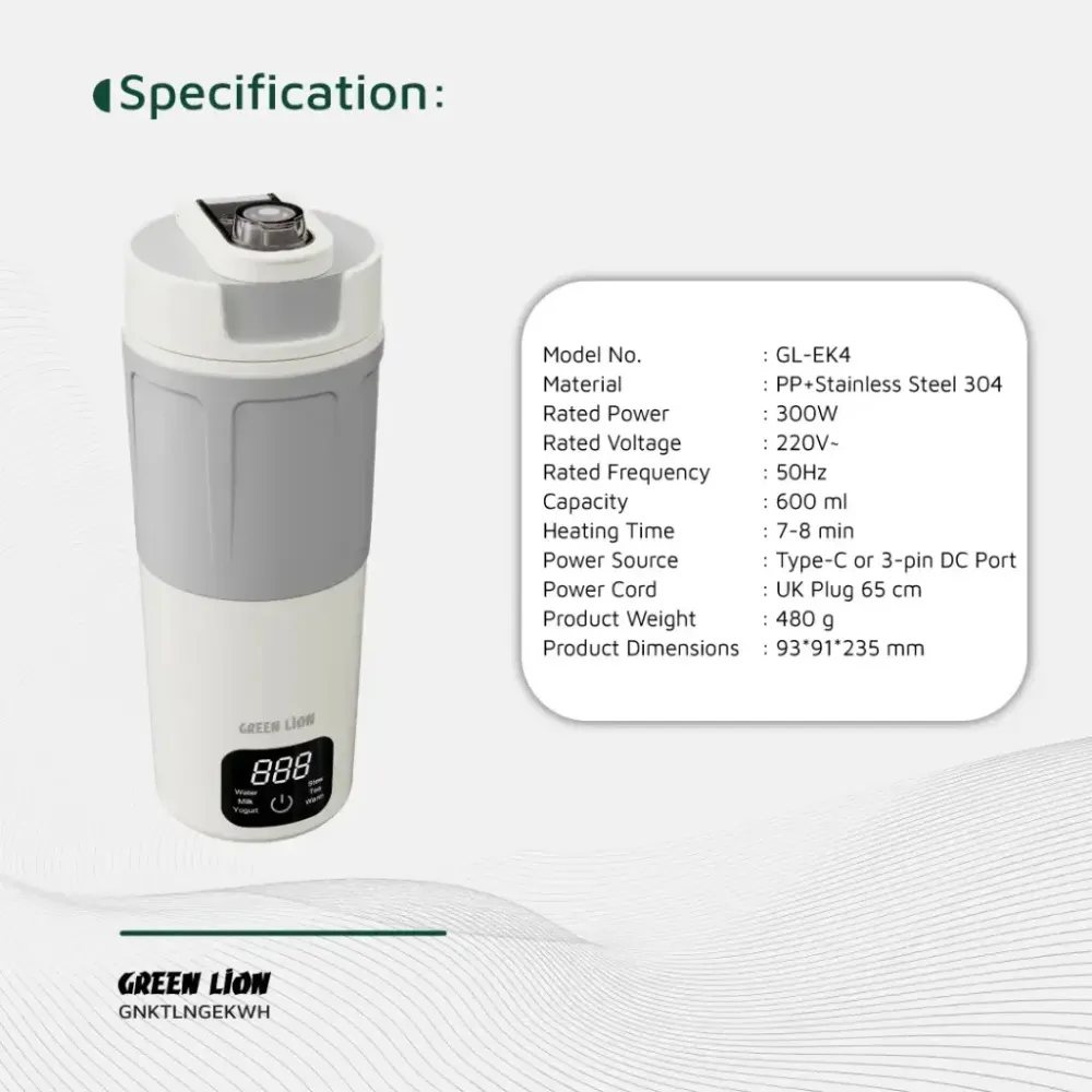 Enjoy modern convenience with the Green Line Portable Electric Kettle, designed for quick boiling and everyday use. With a 600ml capacity and 300W power, it efficiently heats water in 7–8 minutes, making it perfect for home, office, or travel. Built with durable PP plastic and 304 stainless steel, this kettle ensures long-lasting performance and food-safe use. Its touch control panel with temperature display makes operation effortless, while keep warm mode, auto shut-off, and boil-dry protection provide safety and peace of mind. Compact, efficient, and stylish—this kettle is an excellent companion for tea, coffee, or instant meals.