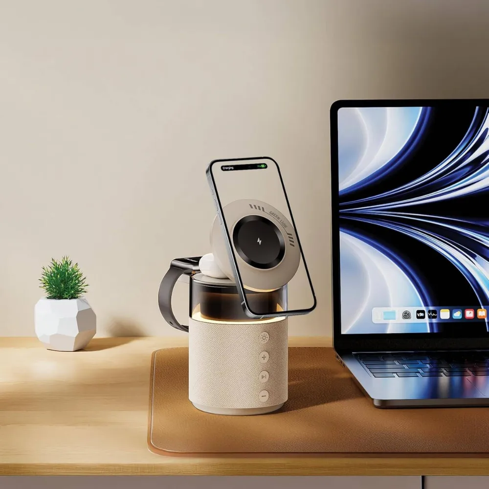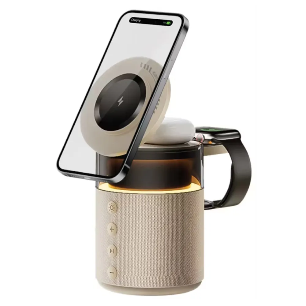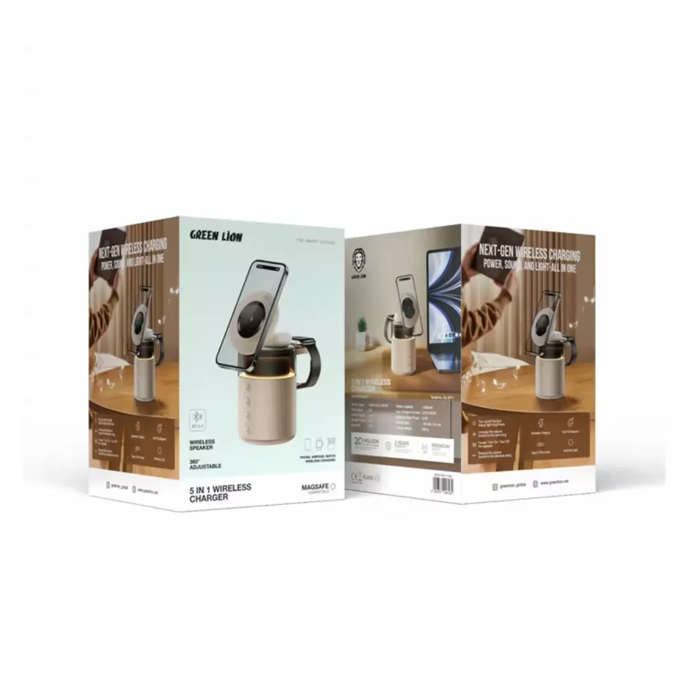 The Green Lion 5-in-1 Wireless Charger is the ultimate blend of charging and entertainment in one stylish device. Designed for modern lifestyles, it wirelessly powers your phone, smartwatch, and earbuds while doubling as a Bluetooth speaker with immersive sound. With MagSafe compatibility, 360° adjustability, and a soothing ambient light, this multi-functional charger is perfect for your desk, bedside, or travel needs.
