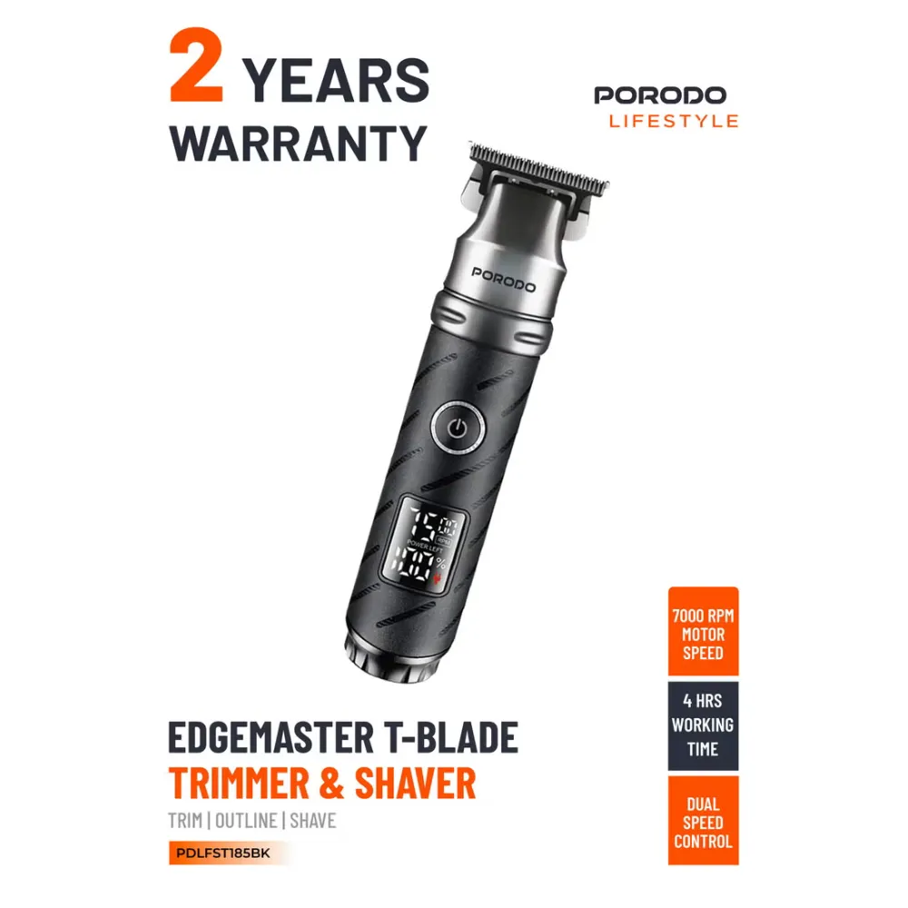 Achieve precise grooming with the Porodo Lifestyle Edgemaster T-Blade Trimmer & Shaver, a premium all-in-one solution for trimming, edging, and shaving. Built with a durable zinc alloy body, it combines strength, style, and long-lasting reliability. Powered by a 7000RPM high-performance motor, it delivers smooth and consistent results whether you’re shaping a beard, detailing edges, or maintaining a clean shave. The 2000mAh rechargeable battery provides up to 4 hours of runtime on a single charge, with USB-C fast charging restoring full power in just 2.5 hours. Its dual-speed control offers flexibility for different grooming needs, while the included 1/2/3mm comb guides allow for customizable length options. Compact and comfortable to handle, the Edgemaster is perfect for both professional barbers and at-home users.