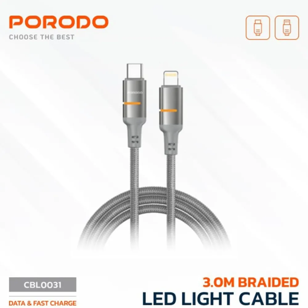 The Porodo 30W USB-C to Lightning Braided Cable is built for speed, strength, and convenience. Supporting up to 30W fast charging and 480Mbps data transfer, it ensures your devices stay powered and synced without interruption. With its extended 3-meter length, you can charge and use your devices comfortably at home, in the office, or while traveling. Crafted with a reinforced braided design, this cable is highly durable, tangle-free, and built to withstand everyday wear and tear. Integrated overcurrent and overheating protection guarantee safe and reliable charging. Universally compatible with iPhone, iPad, and other Lightning devices, this cable is a must-have for efficient charging and syncing.