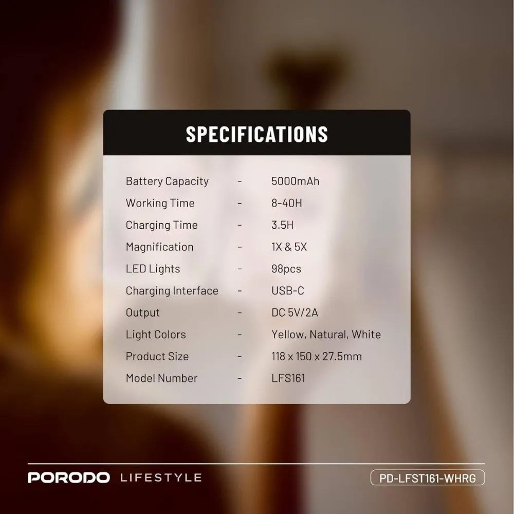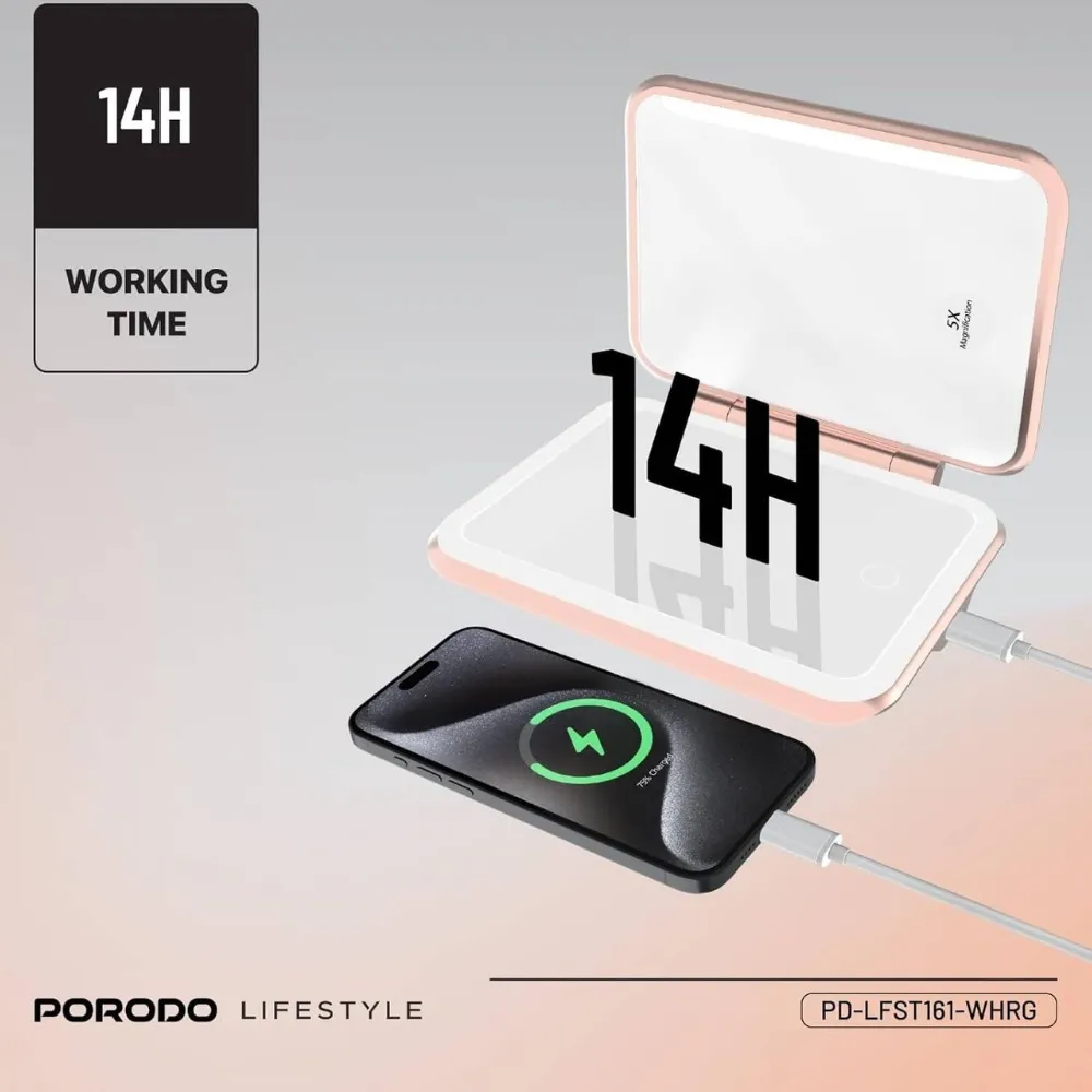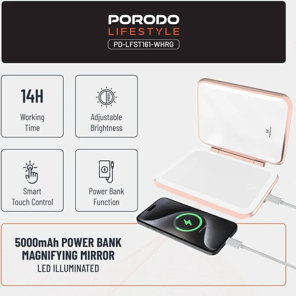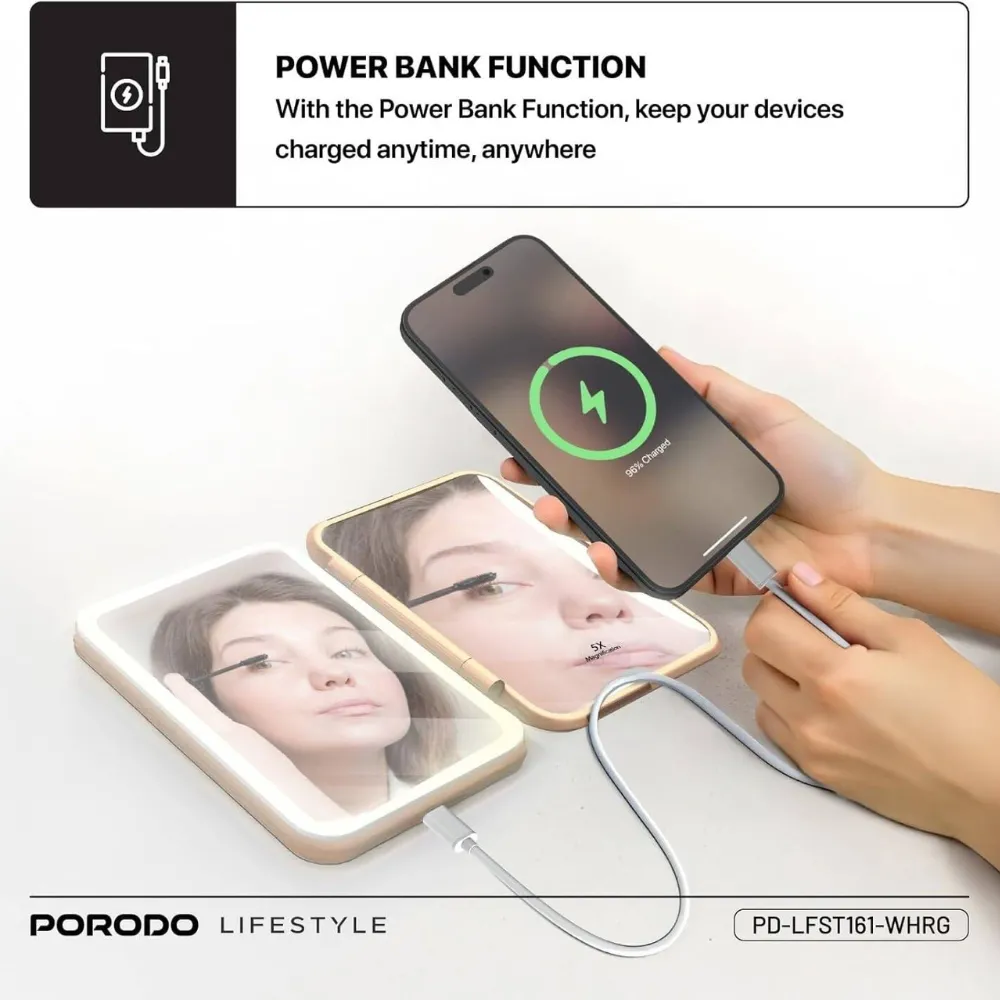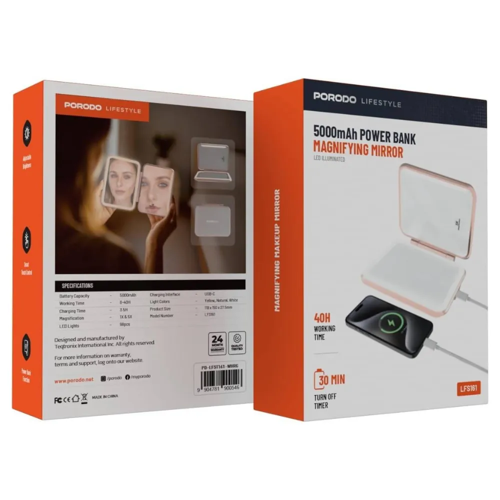 Stay powered and look flawless with the Porodo 5000mAh Power Bank Magnifying Makeup Mirror. Designed with portability in mind, it combines a high-capacity power bank with an illuminated makeup mirror for beauty on the go. Featuring adjustable LED lighting, 1X & 5X magnification, and smart touch controls, it’s perfect for quick touch-ups while keeping your devices charged.