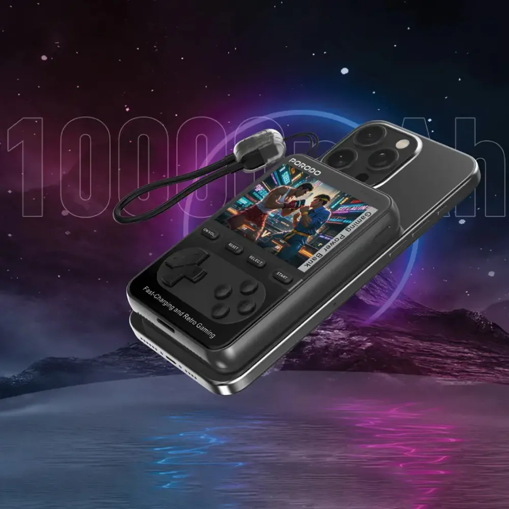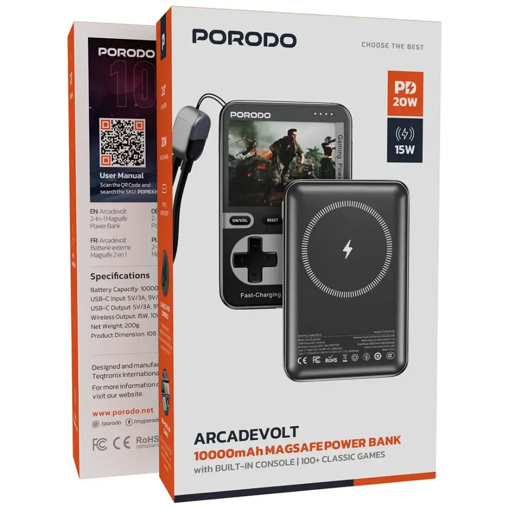 Stay powered and entertained with the Porodo Arcadevolt 10000mAh MagSafe Power Bank. Designed for both functionality and fun, it delivers fast charging capabilities alongside a built-in 2.8” HD gaming display featuring over 100 classic games. With a strong magnetic grip for MagSafe devices, versatile wired and wireless charging options, and portable design, it’s the perfect companion for travel, work, or downtime gaming.