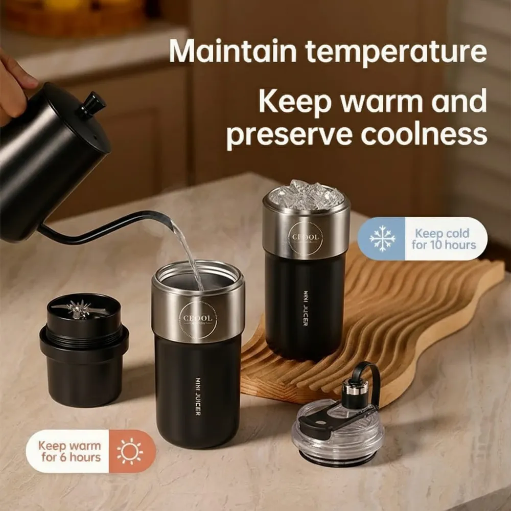 Enjoy fresh fruit juices anytime, anywhere with the CEOOL Portable Juicer Bottle. Compact yet powerful, this mini blender features 26 stainless steel blades to crush ice and blend fruits quickly, while maintaining cold temperature with its insulation design. Rechargeable via USB, it’s perfect for home, office, or travel, offering convenience and freshness in a portable, lightweight design. Automatic pulp ejection and a durable plastic body make it easy to clean and maintain.