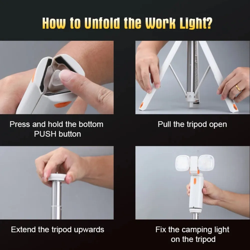This LED Work Light is designed to deliver exceptional brightness, versatility, and long-lasting power for any task—whether you're repairing a car, photographing a subject, working outdoors, or handling DIY projects at home. With up to 2,000 lumens, stepless color temperature adjustment, and multiple brightness levels, it adapts to any environment with ease. Its lightweight, compact body makes it easy to carry, while the magnetic base and rotating stand offer hands-free use from virtually any angle. Built to withstand tough conditions, it's the ultimate all-purpose work light for professionals and hobbyists alike.