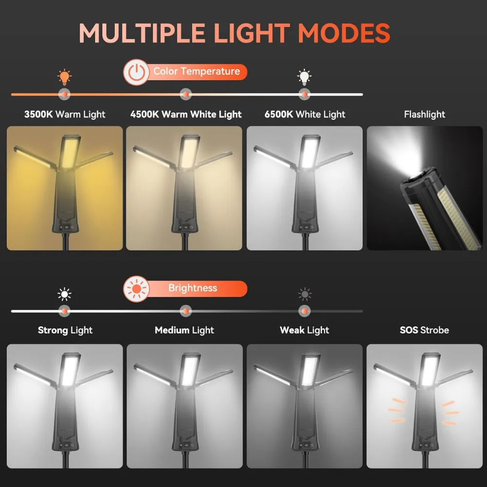 The 15,000mAh Rechargeable Camping Light is a powerful all-in-one lighting solution designed for outdoor adventures, emergency use, workshops, and job sites. Featuring three adjustable LED lamp heads, 5500 lumens brightness, and a long-lasting high-capacity battery, it provides reliable illumination anywhere you need it. With multiple lighting modes, a detachable 86" tripod, and a magnetic base for hands-free use, this versatile light adapts to any environment. Durable, portable, and multifunctional, it is an essential tool for camping, work, and emergency preparedness.