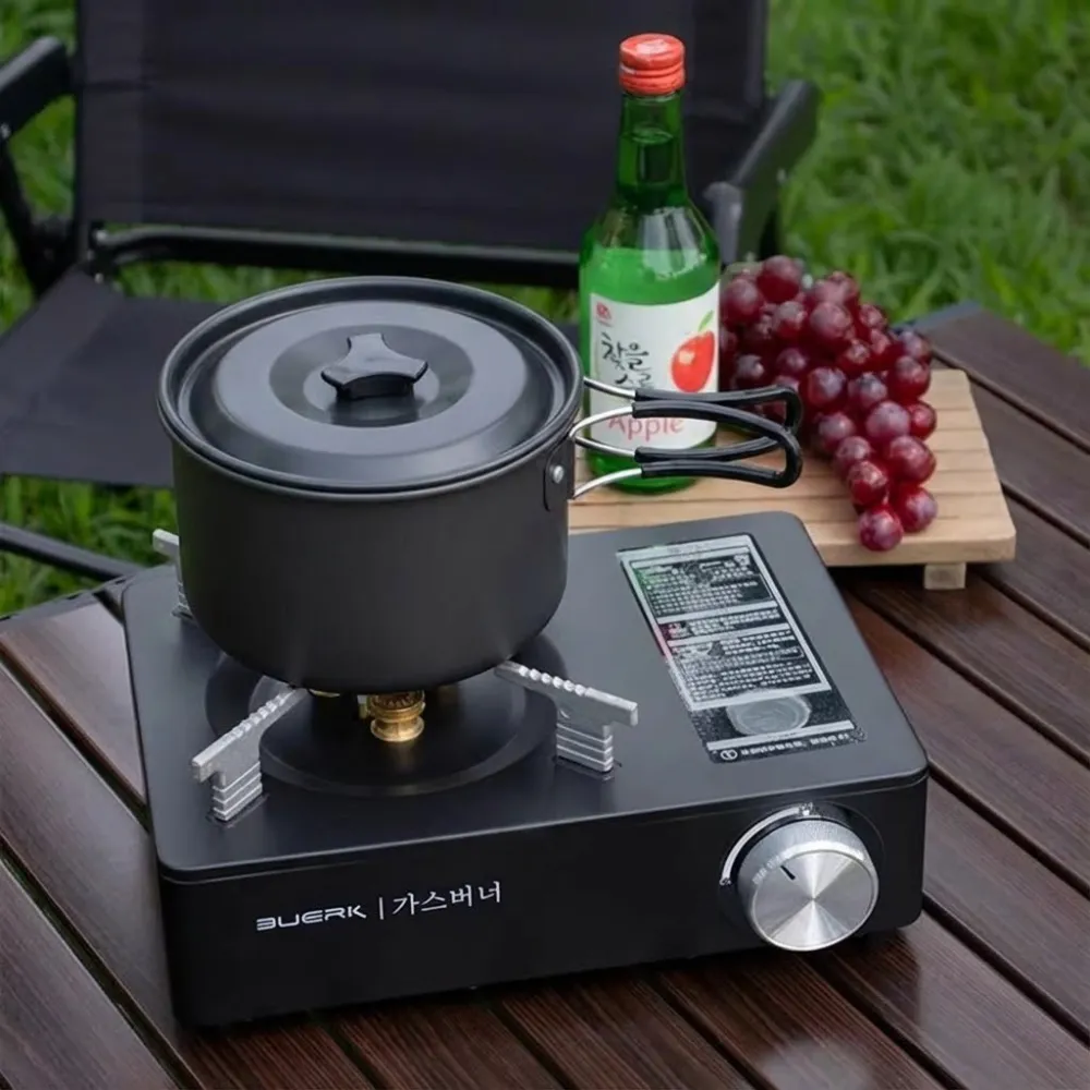 The BUERK Portable Single Gas Stove is a sleek and powerful burner designed for outdoor cooking, camping, picnics, and home backup use. With a durable metal construction and precision flame-control knob, it provides stable and efficient heat for boiling, frying, grilling, and more. Lightweight and compact, it’s easy to pack, store, and transport — making it an ideal companion for both indoor and outdoor cooking needs.