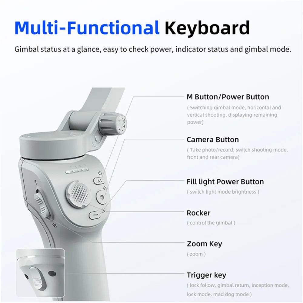 Capture smooth, cinematic videos anywhere with the M01 3-Axis Handheld Gimbal Stabilizer. Featuring advanced anti-shake technology and a built-in adjustable fill light, this stabilizer keeps footage stable and beautifully lit. Perfect for creators, vloggers, and livestreamers, it offers intelligent face tracking, front-rear camera switching, and app integration for creative shooting options. Compact, foldable, and easy to operate — just grab, shoot, and elevate your content.