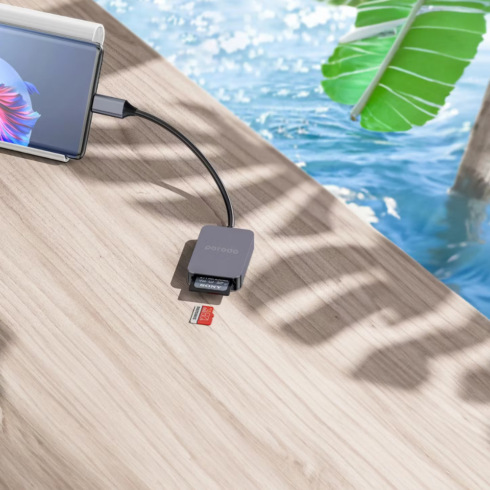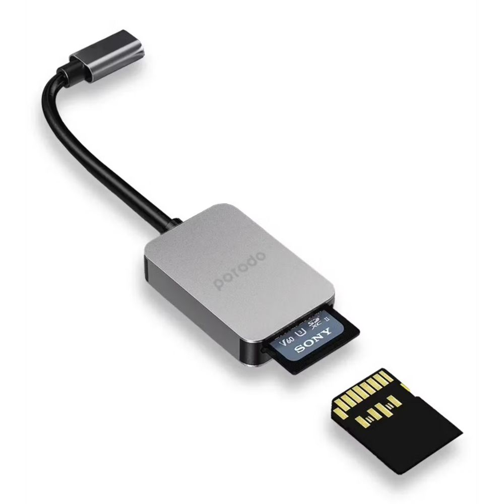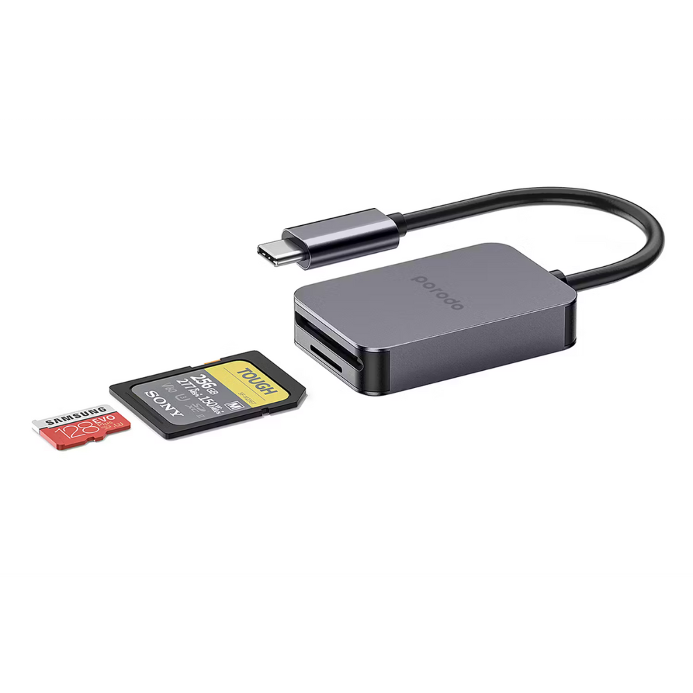 Transfer your photos, videos, and files at high speed with the Porodo 2-in-1 USB-C Card Reader. Designed for modern devices, it features a USB-C input and supports both SD V4.0 and Micro SD V3.0 cards for seamless data access. With ultra-fast 5Gbps transfer speeds, you can move large media files instantly—perfect for photographers, videographers, and content creators. Lightweight and compact, it easily fits in your pocket or bag, making it the ideal tool for quick data handling anywhere you go. Stay productive and keep your workflow smooth whether you're at home, in the studio, or traveling.