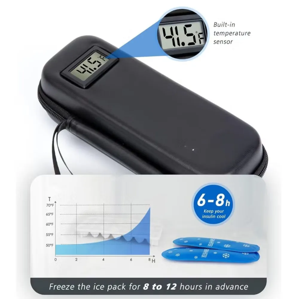 Travel with confidence using this Insulin Cooler Travel Case, specially designed to keep insulin and temperature-sensitive medications safe and effective on the go. Featuring a real-time Fahrenheit temperature display, it allows easy monitoring of internal conditions at a glance. Its compact yet spacious design makes it ideal for daily use, flights, road trips, and outdoor activities. With high-quality insulation materials and TSA-approved ice packs, this case ensures reliable cooling wherever life takes you.