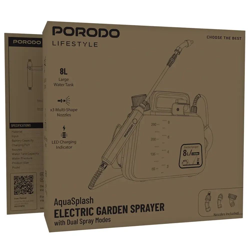 Make watering and cleaning tasks effortless with the Porodo Lifestyle Aqua Splash Electric Garden Sprayer. Designed for versatility and efficiency, this electric sprayer features a large 8-liter water tank for extended use without frequent refills. Its dual spray settings and multiple nozzle options allow precise control for delicate plants or tougher household cleaning jobs. With a rechargeable battery, durable construction, and user-friendly design, it’s a reliable solution for both garden care and everyday cleaning needs.