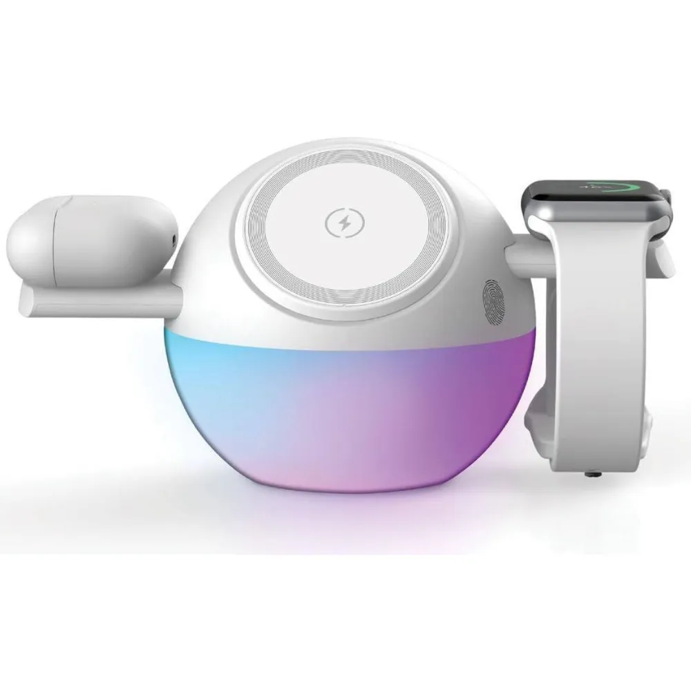 Simplify your charging setup with the Porodo Orbix 3-In-1 Wireless Charger, a sleek and powerful charging station designed for Apple users. Featuring a secure MagSafe-compatible magnetic dock, it delivers up to 15W fast wireless charging while holding your phone firmly in place. The integrated adjustable ambient RGB lighting adds a modern touch, making it perfect for desks and nightstands. With simultaneous charging for your iPhone, Apple Watch, and earbuds, this all-in-one solution keeps your space organized and cable-free.