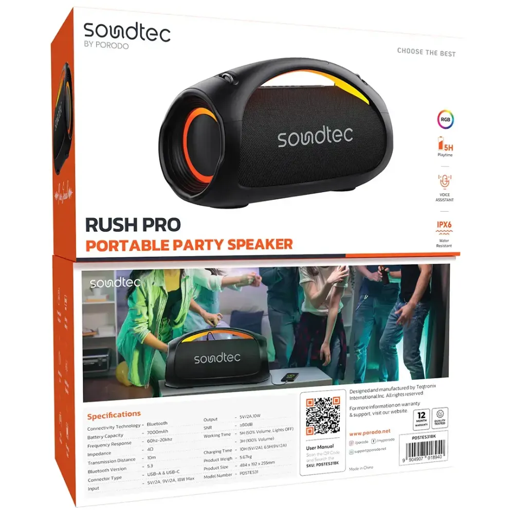 Bring powerful sound and vibrant energy to every gathering with the Porodo Soundtech Rush Pro Party Speaker. Engineered for party lovers, this portable speaker delivers deep bass and dynamic audio performance in a premium satin black finish. With advanced Bluetooth 5.3 connectivity, beat-synced RGB lighting, and a long-lasting battery, it’s built to keep the music going indoors or outdoors. Whether you’re hosting a party, relaxing outdoors, or enjoying music on the move, the Rush Pro creates the perfect atmosphere.